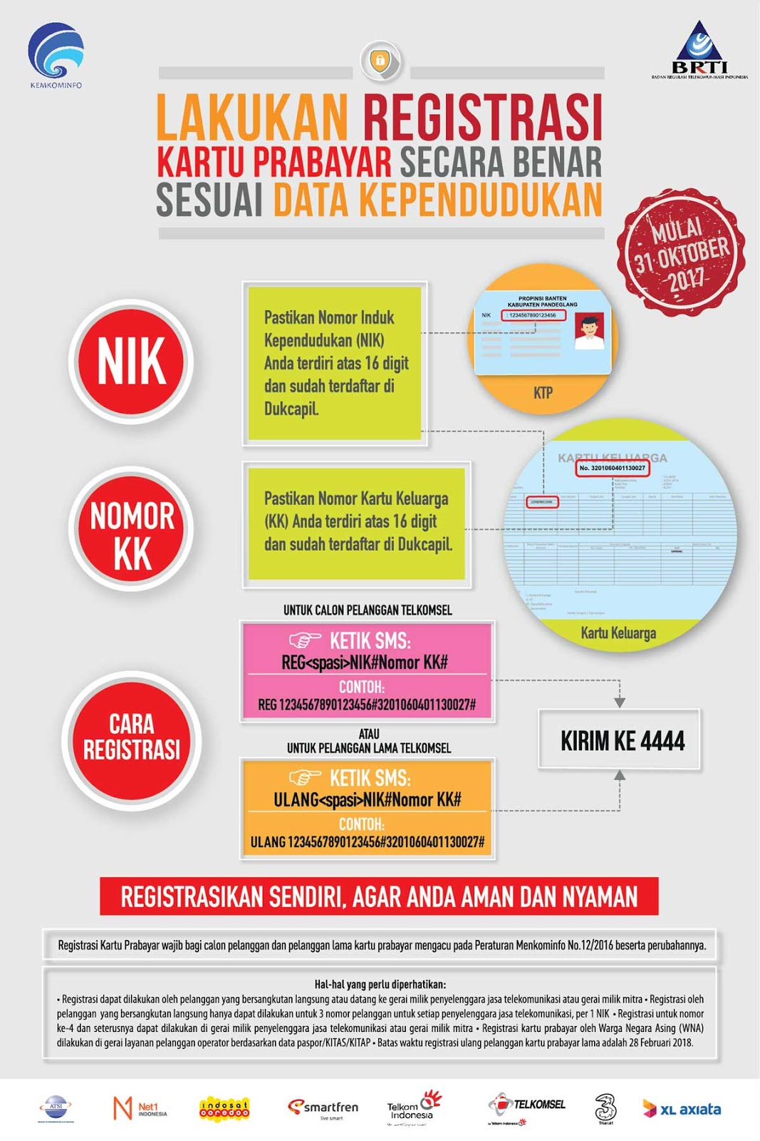 Mengacu pada Peraturan Menkominfo No. 12/2016 Pemerintah mewajibkan semua calon pelanggan dan pelanggan lama kartu prabayar, untuk melakukan registrasi dengan validasi Nomor Induk Kependudukan. Rasakan manfaatnya dengan segera mendaftar ulang kartu prabayar Anda.